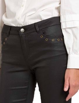 Pantalón Naf Naf Coata. Este pantalón se ha confeccionado en tejido elástico y cuenta con cierre de botón y cremallera, cuatro bolsillos acabados con detalles de arandelas y trabillas en la cintura. Presenta largo pitillo con acabado lacado efecto brillo.